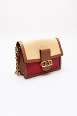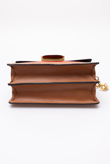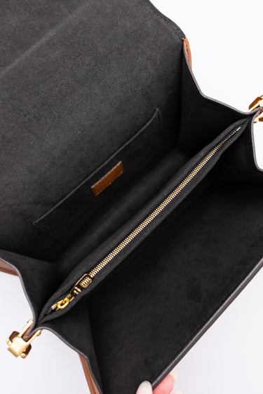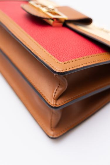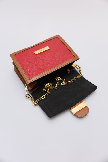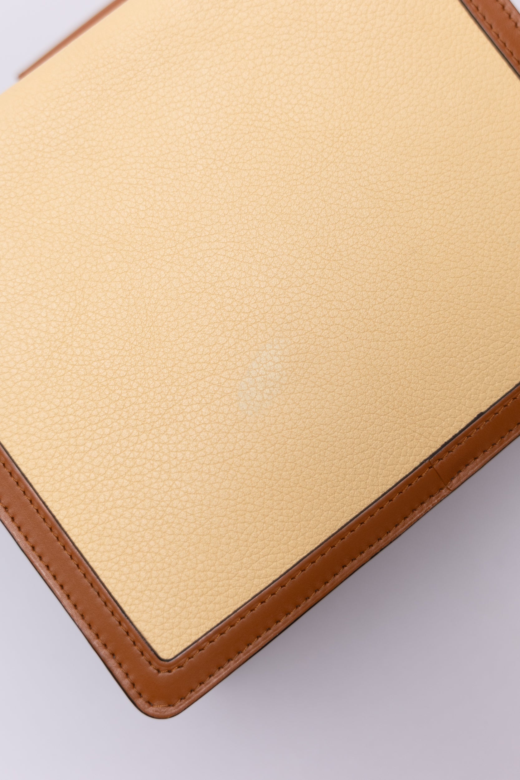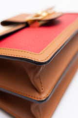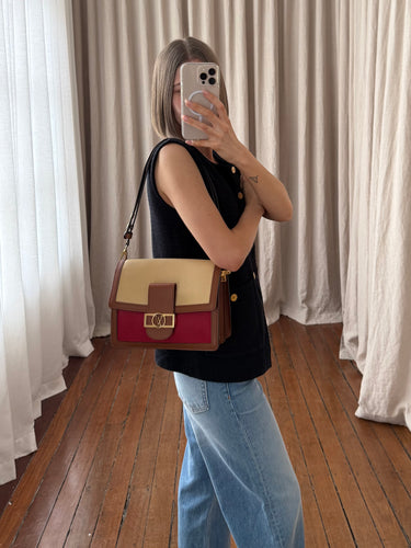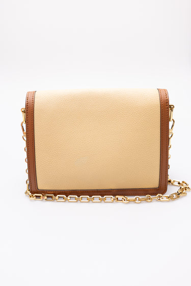 Condition Notes: Discolouration mark on back of bag, minor wear on corners, scratching to leather on front of bag, scratching to hardware, and creasing to leather strap.